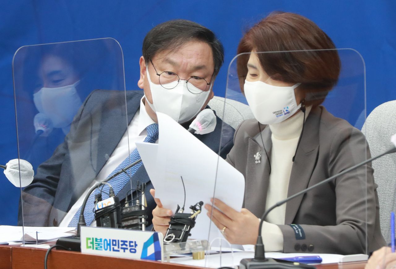 김태년 더불어민주당 원내대표가 10일 국회에서 열린 정책조정회의에 참석, 회의 도중 한정애 정책위의장의 발언 자료를 바라보고 있다./윤동주 기자 doso7@