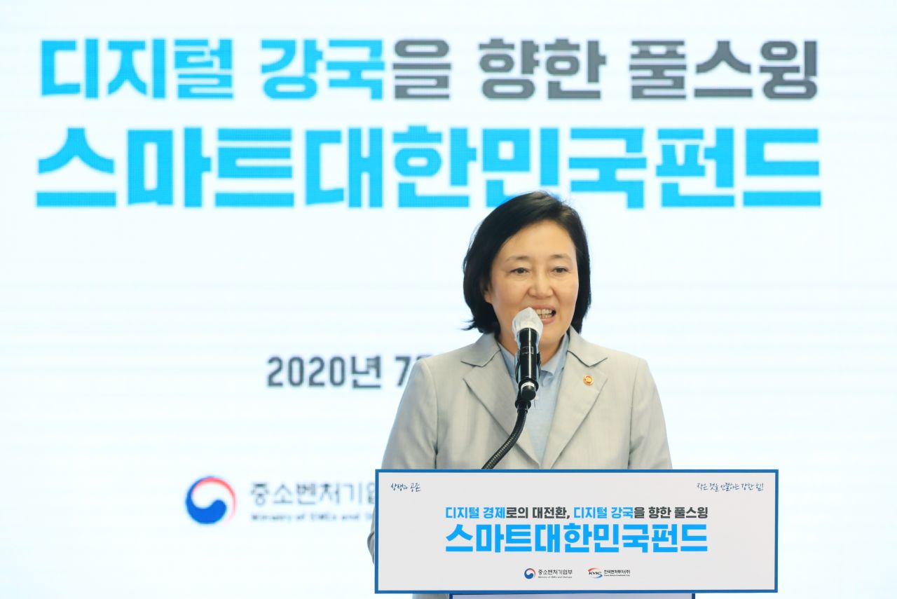 박영선 중소벤처기업부 장관이 20일 서울 역삼동 팁스타운 S1에서 열린 '스마트대한민국펀드 출범식'에 참석해 디지털 시대로의 전환과 혁신기업 투자 등에 대해 이야기하고 있다.