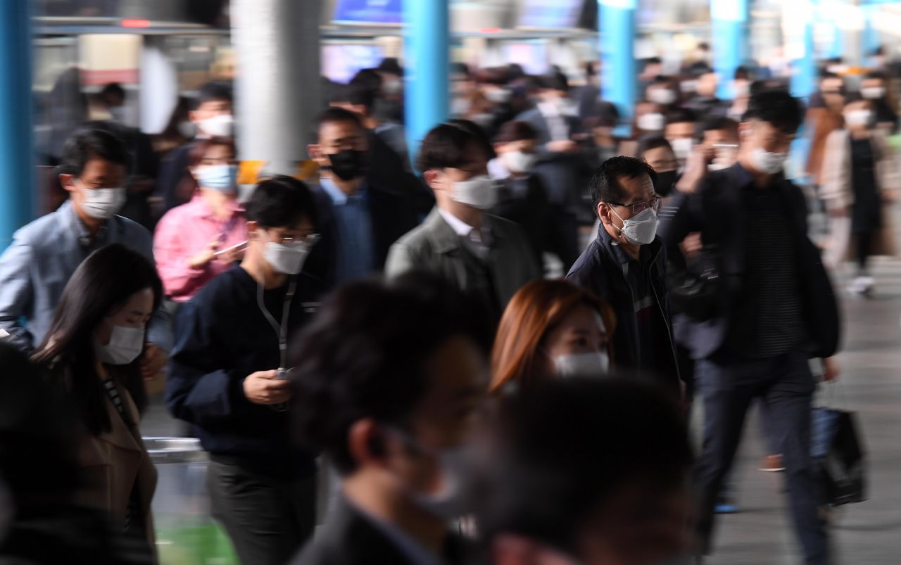 대중교통·의료기관 등에 대한 마스크 착용 의무화가 시작된 13일 서울 구로구 신도림역에서 시민들이 마스크를 쓴 채 발걸음을 옮기고 있다. 이날부터 대중교통과 의료기관 이용자와 종사자, 집회 참석자 등에게 마스크 착용을 의무화하고 이 밖의 시설에서도 사회적 거리두기 단계 등에 따라 마스크 착용을 강제할 수 있는 제도가 시행된다. 한 달간의 계도기간을 거쳐 내달 13일부터 과태료가 부과될 예정이다./김현민 기자 kimhyun81@