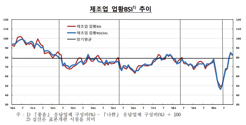 제조업 업황실적 BSI가 하락한 것은 7개월 만이다. 다만 제조업 업황 실적 BSI는 장기평균(79, 2003년 1월∼2019년 12월)보다는 높다.