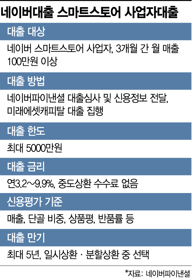 30일 금융권에 따르면 네이버 자회사인 네이버파이낸셜이 네이버 스마트스토어 입점 사업자 전용으로 내놓은 미래에셋캐피탈 스마트스토어 사업자대출이 다음달 1일 정식 출시된다. 네이버파이낸셜은 본격적인 상품 출시에 앞서 시범 운영 성격으로 지난 1일부터 베타 서비스를 진행 중인 가운데 인터넷 커뮤니티 등에 대출 이용자들의 불만과 항의 글들이 올라오고 있다.