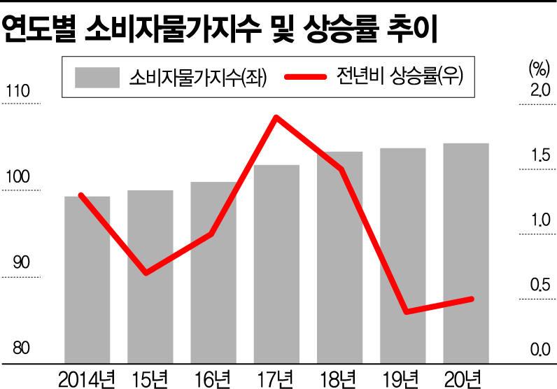 통계청이 지난 12월31일 발표한 '(2020년)12월 및 연간 소비자물가동향'에 따르면 지난해 연간 소비자물가지수는 105.42(2015년=100)로 전년대비 0.5% 상승에 그치며, 2019년 0.4%에 이어 2년 연속 0%대를 기록했다. 연간 소비자물가 상승률이 0%를 기록한 것은 외환위기 직후인 1999년(0.8%)을 비롯해 2015년(0.7%), 2019년(0.4%) 등 네 차례 뿐이다.