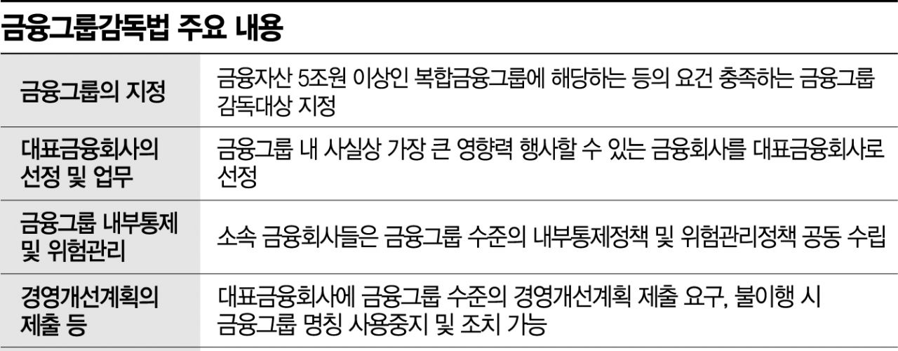 또 자본적정성 비율이 100%에 미달하거나 위험관리가 부실한 금융그룹은 금융당국에 자본확충이나 위험자산 매각 등을 담은 경영개선계획을 제출해야 한다. 계획을 이행하지 않은 금융그룹에 대해 금융당국은 명칭사용 금지나 각 금융업법에 따른 조치를 명령할 수 있다.