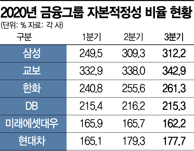 교보의 자본적정성 비율은 1분기 332.9%, 2분기 338.0%, 3분기 342.9%로 꾸준한 증가세를 달성했다. 삼성도 자본확보에 나서면서 자본적정성 비율이 1분기에 비해 무려 62.7%포인트가 오른 312.2%를 기록했다. 1분기에 240.8%였던 한화도 3분기 261.3%로 20.5%포인트 증가했다.