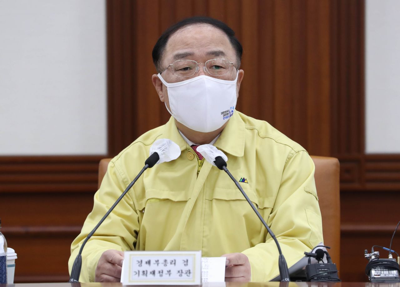 홍남기 경제부총리 겸 기획재정부 장관이 23일 서울 종로구 정부서울청사에서 열린 '비상 경제 중앙대책본부회의 겸 한국판 뉴딜 관계장관회의'에 참석해 모두발언 하고 있다./강진형 기자aymsdream@