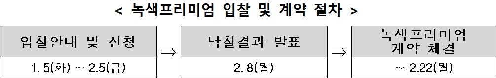 이날부터 다음달 5일 오후 6시까지 녹색 프리미엄 입찰 참여공고 및 신청을 받는다. 다음달 8일 낙찰 물량과 가격이 확정되고 같은 달 22일 정식 계약을 맺게 된다.
