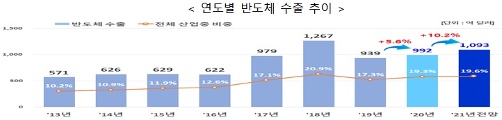 산업부와 반도체협회는 올해 반도체 수출이 지난해보다 10.2% 증가한 1075억~1110억달러를 기록할 것으로 내다봤다. 2018년 1267억달러에 이어 역대 2위의 수출 실적을 낼 것으로 전망했다.