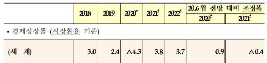 WB는 동아시아·태평양 지역을 제외한 모든 지역에서 2020년 역성장을 예상했다. 또 2020년과 2021년 모두 기존 전망 보다 개선된 지역은 동아시아·태평양, 중남미 지역이 유일하다고 밝혔다.