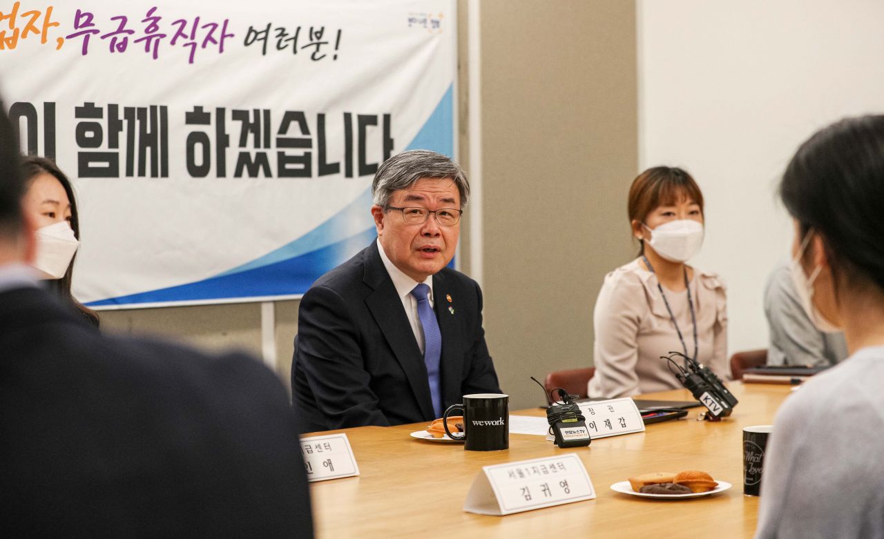 이재갑 고용노동부 장관이 3일 서울 중구 코로나19 긴급고용안정지원금지원단을 방문해 관계자들과 간담회하고 있다./강진형 기자aymsdream@