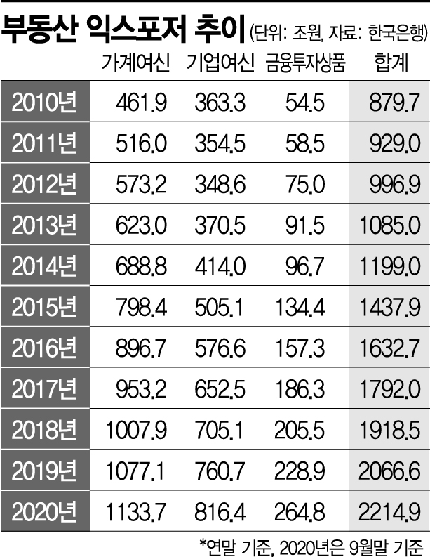 부동산금융 익스포저는 가계 및 부동산 관련 기업에 대한 여신과 부동산 관련 금융투자상품에 투입된 자금을 말한다. 지난 2010년 879조7000억원으로 1000억원을 밑돌았으나 꾸준히 증가해 지난해 사상 처음 2000조원을 돌파했다.