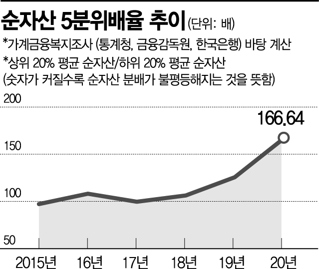 7일 아시아경제신문이 통계청ㆍ금융감독원ㆍ한국은행이 내놓은 '2020년 가계금융ㆍ복지조사'를 분석한 결과에 따르면, 지난해 3월 말 기준 '순자산 5분위 배율'은 166.64배로, 직전해(125.60배) 대비 41.04배포인트 오른 것으로 나타났다. 순자산 5분위 배율이란 보유한 순자산 상위 20% 그룹(5분위) 가구의 평균 순자산을 하위 20%(1분위) 순자산으로 나눈 값이다. 수치가 높을수록 상ㆍ하위 그룹간 순자산 격차가 커지고 있다는 뜻이다.