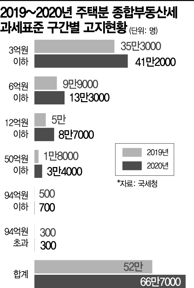 7일 국세청이 국회에 제출한 ‘2019~2020년 주택분 종부세 과세표준 구간별 고지현황’에 따르면 지난해 종부세를 고지받은 인원은 66만7000명으로 전년 대비 14만7000명(28.3%) 증가했다. 이 가운데 3억원 이하 과표구간에 해당하는 납세자는 같은 기간 5만9000명이 늘어난 41만2000명을 기록했다. 정부는 앞서 부동산 가격 안정화 대책의 일환으로 2018년 세법 개정을 통해 2019년 고지분부터 과세표준 3억원 이하 구간을 신설한 바 있다. 해당 과표구간 내 대상자 증가 규모는 신설 2년 차인 지난해 고지액에서 처음 확인된 것이다.