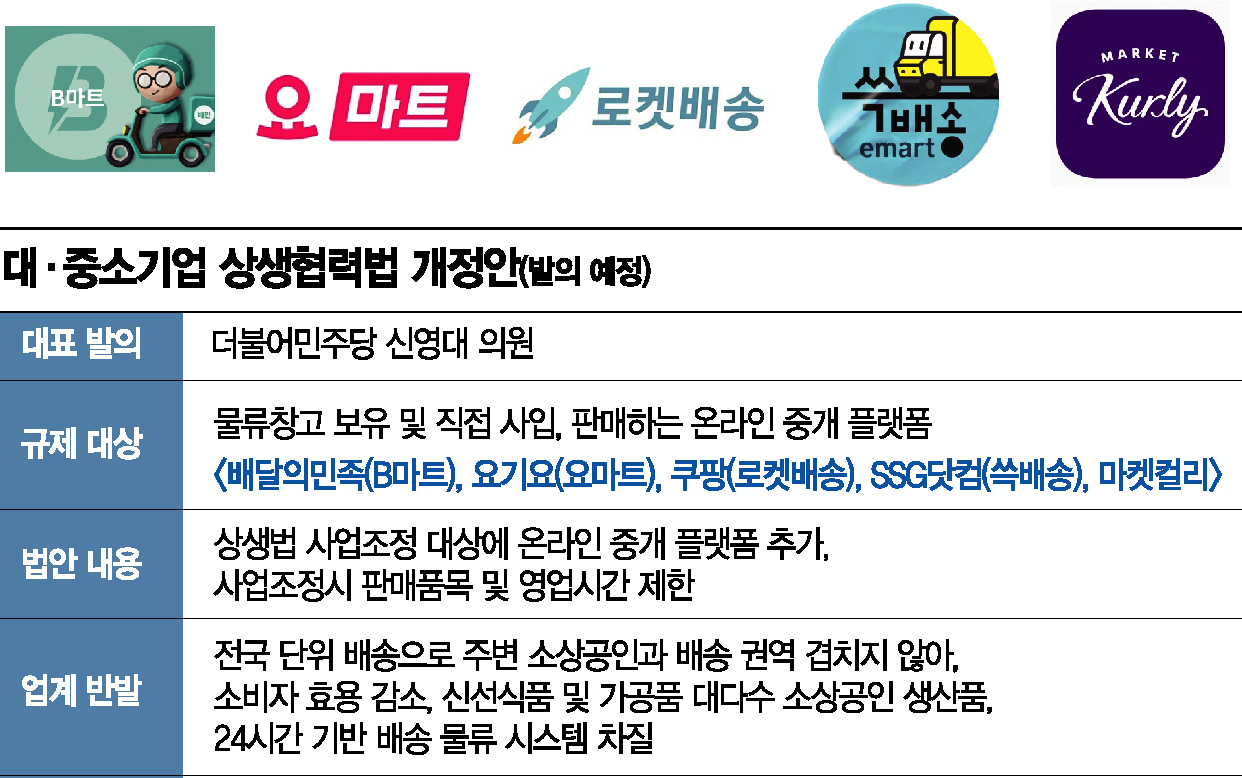 온라인 유통 직격탄직격탄을 맞게 되는 곳은 당초 법안이 겨냥한 배달 중개 플랫폼으로서 마트를 운영하는 요기요(요마트)와 배달의민족(B마트)이었지만 물류창고를 보유하고 직접 사입 후 판매하는 사업자를 직접 규제하겠다고 나서며 일이 커졌다. 쿠팡(로켓배송), SSG닷컴(쓱배송), 마켓컬리, 오아시스 등 새벽배송 업체 대부분이 포함된다.