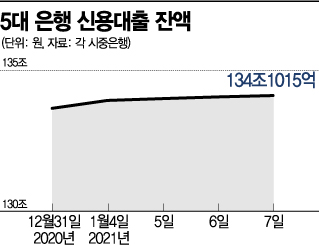 4일에만 2798억원…4영업일 동안 4533억원8일 금융권에 따르면 KB국민·신한·하나·우리·NH농협 등 5대 시중은행의 신용대출 잔액은 올 들어 4~7일 4영업일 동안 4533억원 증가했다. 지난해 말 일시적으로 중단됐던 신용대출이 새해 들어 재개된 첫 날인 4일에는 2798억원이 급증했고 5일에는 647억원, 6일과 7일에는 각각 604억원, 484억원이 늘었다.