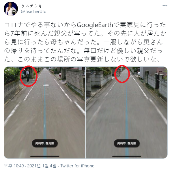 지난 4일 'TeacherUfo'라는 계정을 쓰는 한 이용자는 "코로나 시국이라 할 일이 없어 구글어스를 통해 본가(군마현 다카사키시)를 보러 갔더니 7년 전 돌아가신 아버지가 (대문 앞에 서 계시는 모습이) 찍혀 있었다"라며 사진 두 장과 함께 글을 올렸다.