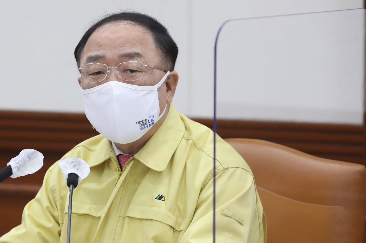 홍남기 경제부총리 겸 기획재정부 장관이 23일 서울 종로구 정부서울청사에서 열린 '비상 경제 중앙대책본부회의 겸 한국판 뉴딜 관계장관회의'에 참석해 모두발언 하고 있다./강진형 기자aymsdream@