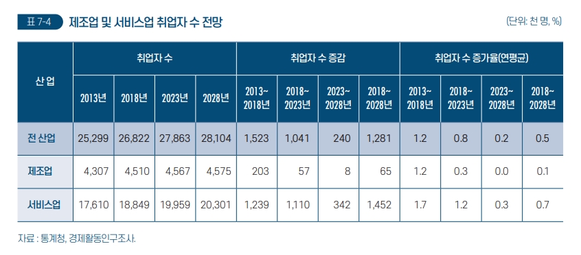 특히 고령화가 빠르게 진행되면서 서비스업에서 보건업 및 사회복지 서비스업 등 공공서비스 부문은 비교적 많은 취업자가 생길 것으로 예상됐다. 2018년부터 2028년까지 사회복지 서비스업에서 33만3000명, 보건업에서 29만2000명 취업자가 늘어날 것으로 전망된다.
