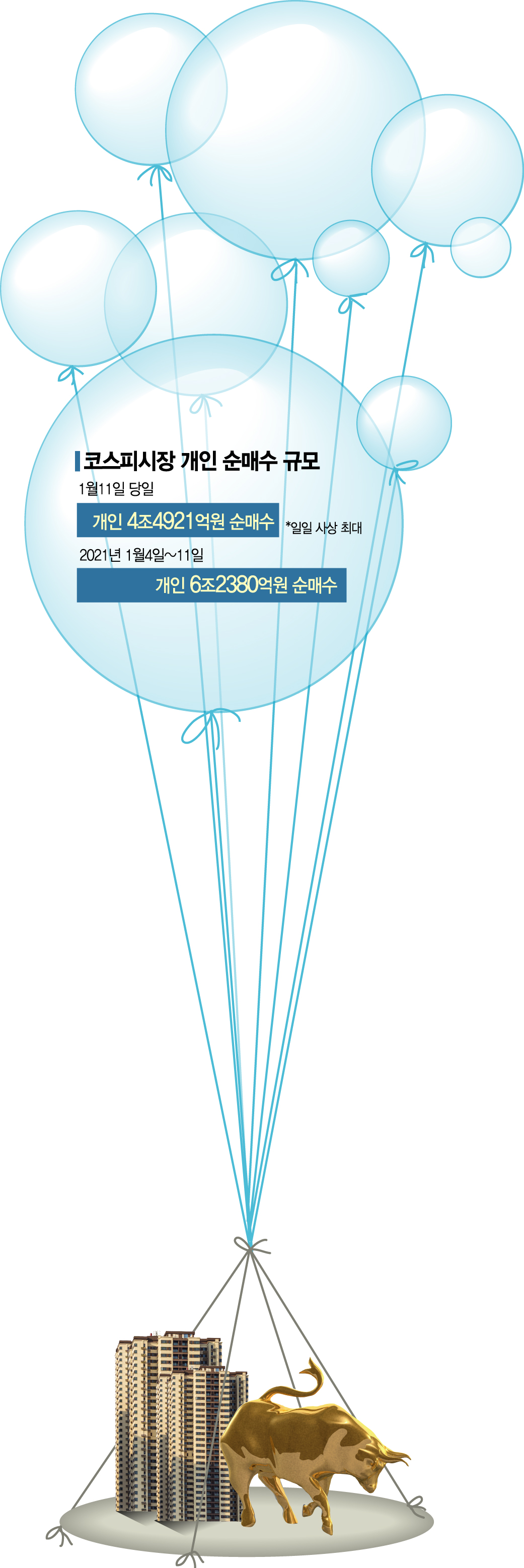 12일 한국거래소에 따르면 전날 유가증권(코스피)시장에서 개인은 4조4921억원을 순매수했다. 일별 기준 사상 최대 규모로, 직전 최고 기록(2020년 11월30일·2조2206억원)의 2배를 넘는 규모다. 올해 들어 전날까지 개인은 6조2380억원이나 주식을 사들였다.
