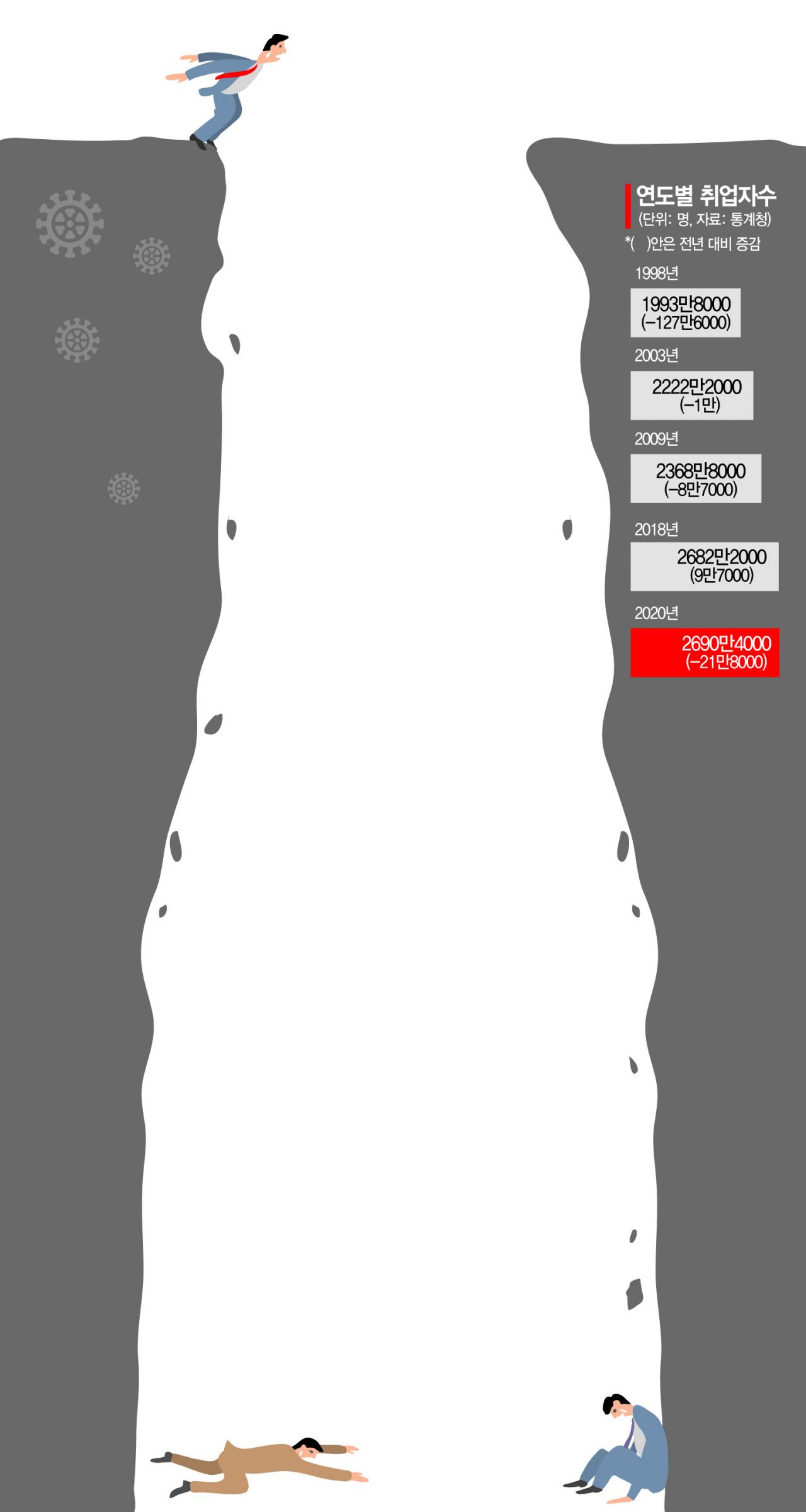 [세종=아시아경제 김현정·주상돈 기자] 지난해 고용 상황이 1998년 국제통화기금(IMF) 외환 위기 이후 최악을 기록했다. 신종 코로나바이러스감염증(코로나19) 사태로 경제활동이 급격히 위축되면서 연간 취업자 감소 폭이 22년 만에 가장 큰 것으로 나타났다. 취업자 감소는 2009년 글로벌 금융 위기 이후 11년 만이다. 기업들이 채용을 줄인 데다 대면 비중이 높은 서비스업 등 특정 업종의 고용이 급속히 얼어붙은 영향이 컸다.