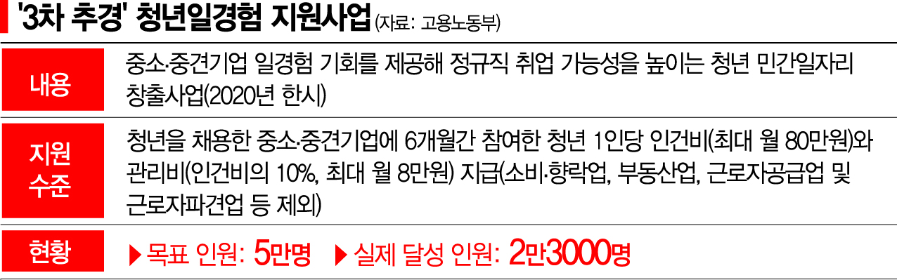13일 고용노동부에 따르면 지난해 7월 3차 추가경정예산(추경)에서 신규 편성된 ‘청년 일경험 지원 사업’ 참여 인원은 같은 해 12월 말 기준으로 2만3000명에 그쳤다. 정부의 예산상 목표치인 5만명의 절반에도 못 미치는 수준이다. 전체 예산 2352억원 가운데 1900억원이 집행됐지만, 이마저도 실지급은 아닌 것으로 나타났다.