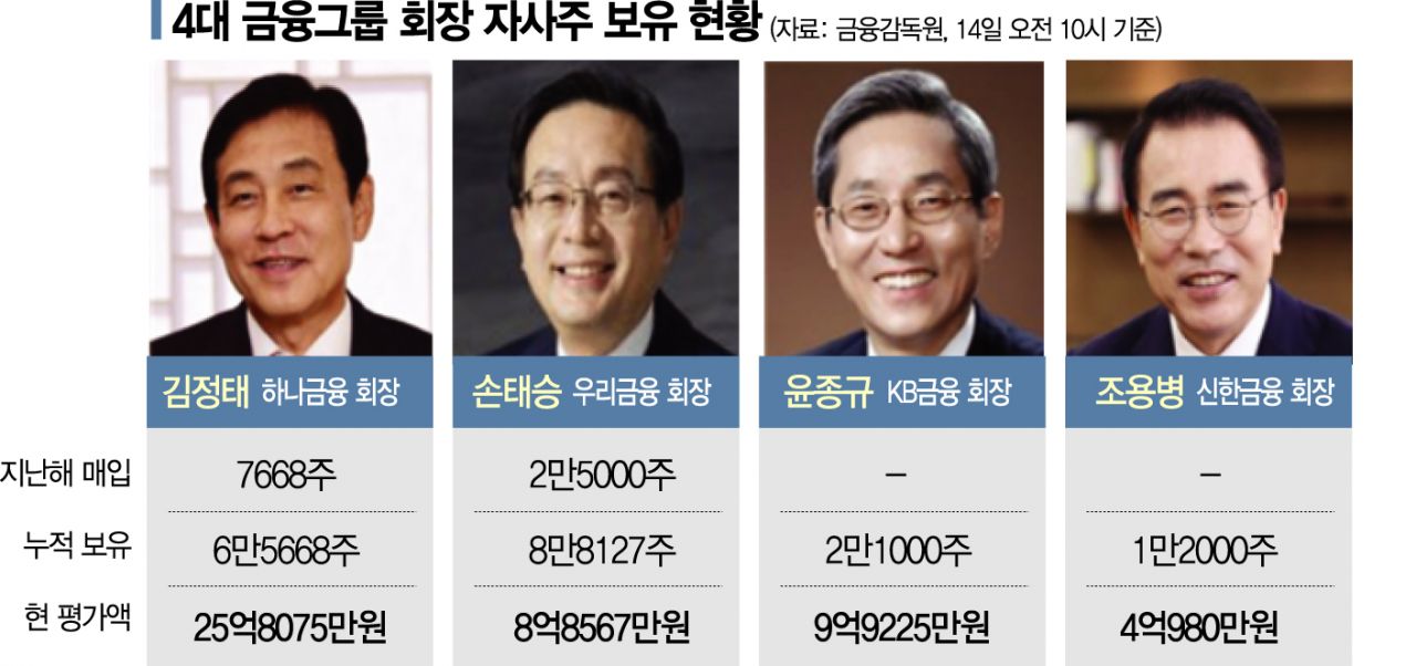 [아시아경제 류태민 기자]‘책임경영’ 강화를 위해 지난해 자사주를 수차례 매입한 김정태 하나금융그룹 회장과 손태승 우리금융그룹 회장의 베팅이 통했다. 상대적으로 낮은 가격에 사들인 주식이 금융주 상승덕에 높은 수익률을 기록하고 있는 것. 반면 지난해 자사주를 사지 않은 윤종규 KB금융그룹 회장과 조용병 신한금융그룹 회장은 평가액이 줄었다.