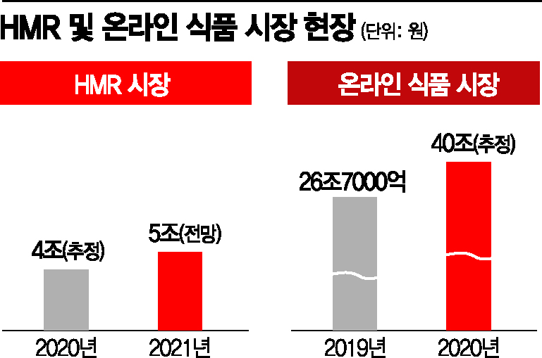 16일 한국농수산식품유통공사에 따르면 지난해 국내 HMR 시장 규모는 4조원을 넘긴 것으로 추정된다. 공사는 2022년 HMR 시장 규모가 5조원 정도로 커질 것으로 예측했으나 코로나19를 만나면서 훨씬 앞당겨질 것으로 보고 있다.