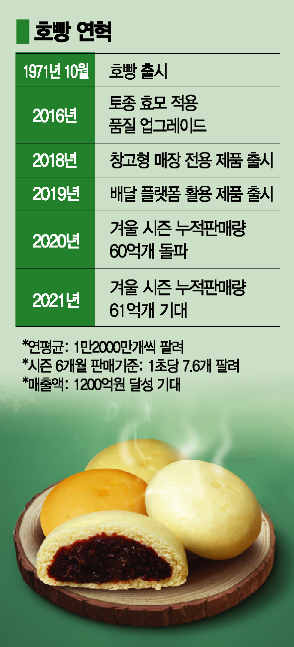 호빵은 1971년 10월 '국내 1호 겨울철 빵'으로 출시됐다. 당시 겨울에는 난방이 잘 안돼 SPC삼립 대리점 진열대의 빵이 얼어붙기 일쑤였다. SPC삼립과 대리점은 겨울에 제품이 팔리지 않아 속앓이를 해야만 했다. 겨울용 빵을 만들어야 판매 부진에서 벗어날 수 있다고 생각한 고 허창성 SPC그룹 명예회장은 연구개발 끝에 호빵을 들고 나왔다. 반응은 폭발적이었다. 본격적인 추위가 시작되는 10월 중순부터 이듬해 2월까지 한정된 기간에만 판매했는데도 불구하고 당시 SPC삼립 연간 매출의 15%를 차지했다.끊임없는 신제품 개발허 명예회장의 아들 허영인 SPC그룹 회장은 호빵에 크고 작은 변화를 가져왔다. 전통의 스테디셀러인 단팥ㆍ야채 호빵을 기본으로 매년 새로운 트렌드를 반영한 신제품을 선보이고 있다. 피자ㆍ고구마ㆍ불닭ㆍ우유ㆍ버거ㆍ골든에그 호빵 등 매년 새로운 원료를 사용한 신제품을 출시하고 있다. 2016년부터는 직접 개발한 '토종효모'를 적용해 호빵의 품질을 끌어올렸다. 그 결과 추억을 사는 중장년층 소비자와 함께 젊은 세대들까지 호빵을 소비하고 있다. 매년 트렌드를 반영해 출시하는 신제품 호빵의 매출 비중은 꾸준히 증가해 2016년까지 10~20%대(전체 호빵 중 신제품 판매율)에서 지난해 30%까지 상승했다.