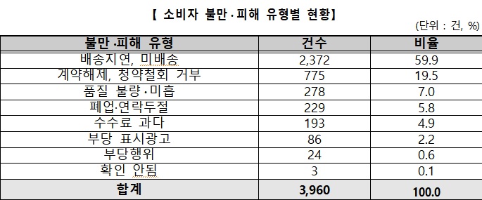 불만·피해 유형을 살펴보면 '배송지연·미배송'이 59.9%(2372건)로 가장 많았다. '계약해제·청약철회 거부'가 19.5%(775건), '품질 불량·미흡'이 7%(278건), '폐업·연락두절'이 5.8%(229건) 등이 뒤를 이었다.