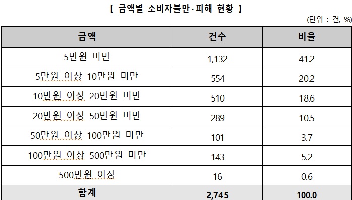 피해 금액을 확인할 수 있는 거래 2745건으로 좁혀보면 10만원 미만 소액 사례가 61.4%였다. '5만원 미만' 구간의 불만·피해가 41.2%(1132건)로 가장 많았지만, '10만원 이상 20만원 미만'도 18.6%(510건)였다.