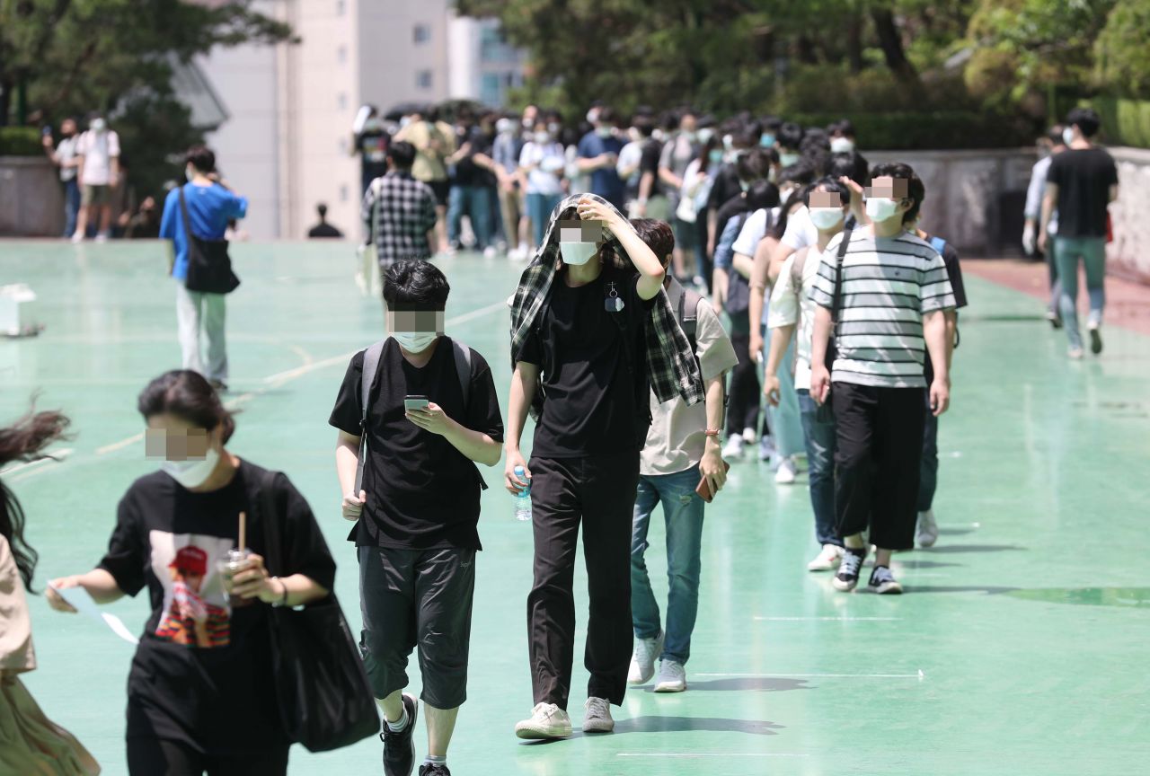 14일 서울 성북구 한 대학교에서 열린 2020년 상반기 한국철도 신입사원 채용 필기시험에서 응시생들이 입장을 위해 줄을 서고 있다. /문호남 기자 munonam@