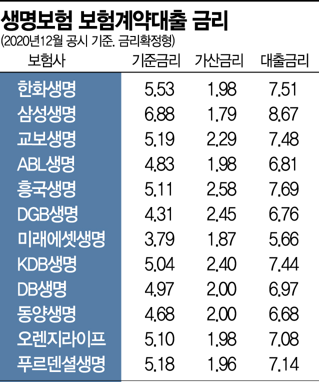 보험계약대출 금리는 기준금리에 가산금리를 더해서 정해지는데 가산금리가 떨어지면서 대출금리도 낮아지고 있다. 23개 생보사 작년 1월에는 금리확정형 대출금리가 평균 6.72%에 달했지만 지난달에는 6.55%로 내림세를 기록 중이다.