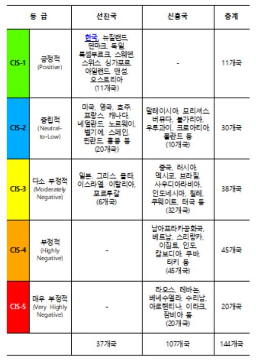 한국 외에 뉴질랜드, 덴마크, 독일, 룩셈부르크, 스웨덴, 스위스, 싱가포르, 아일랜드, 맨섬, 오스트리아 등 11개국이 종합 1등급으로 평가됐다. 2등급은 미국, 영국, 호주, 프랑스 등 선진국과 말레이시아, 모리셔스 등 신흥국 30개국이 받았다. 일본과 중국, 그리스 등 38개국은 3등급을, 남아프리카공화국, 베트남 등 45개국은 4등급을 받았다. 라오스, 레바논, 베네수엘라, 수리남 등 20개국은 가장 낮은 5등급으로 평가됐다.