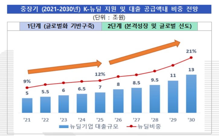 올해부터 2025년까지는 2차전지, 5G 등 수출 주력품목의 글로벌 경쟁력을 더욱 공고히 하기 위해 30조원의 자금 공급이 이루어진다. 2026년부터 2030년까지는 수소에너지 등 K-뉴딜 주요분야가 본격 성장궤도에 진입한 단계로, 우리나라의 그린·디지털 뉴딜 분야 선도국가 부상을 위해 50조원을 공급할 방침이다.