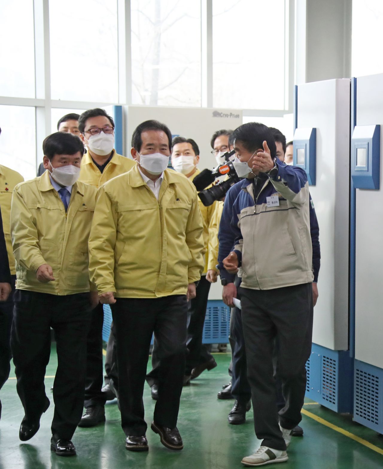 정세균 국무총리가 21일 백신보관용 초저온냉동고 생산 회사인 경기 동두천시 일신바이오베이스 본사를 방문해 홍성대 대표이사의 설명을 들으며 이동하고 있다. 2021.1.21 [이미지출처=연합뉴스]
