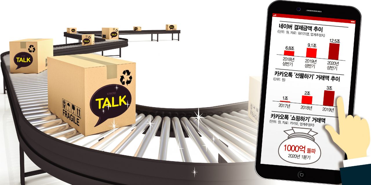 ◆쇼핑 삼키는 네이버ㆍ카카오= 21일 유통 업계 고위 관계자는 "쿠팡, 마켓컬리가 가장 위험한 경쟁자인줄 알았는데 네이버, 카카오가 더 위험한 상황"이라며 "검색과 모바일 플랫폼을 장악한 두 회사에 유통시장의 주도권을 완전히 넘겨줄 수 있다는 위기감이 팽배하다"고 말했다.