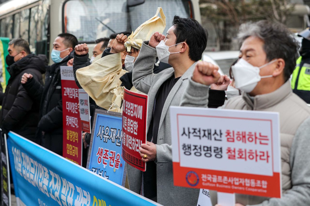 14일 서울 여의도 더불어민주당사 앞에서 헬스장필라테스, 스터디카페, 스크린골프, 코인노래방 등 관계자들이 오는 16일 발표 예정인 집합금지업종 조정 관련 자영업자 3대 공동요구사항을 발표하고 있다./강진형 기자aymsdream@