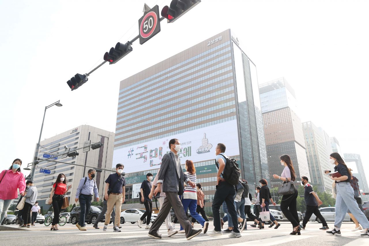 6일 서울 종로구 광화문 교보생명빌딩 외벽에 신종 코로나바이러스 감염증(코로나19) 관련 응원 문구 '#국민 덕분에'가 붙어 있다. /문호남 기자 munonam@