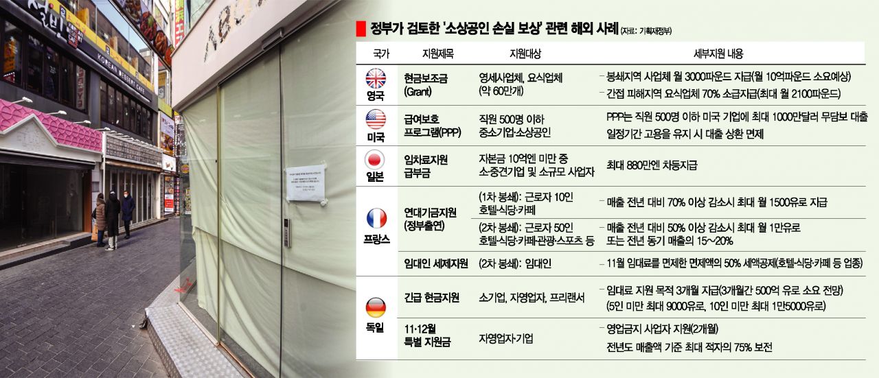 이에 비해 지난해 G7 국가의 명목 국내총생산(GDP) 예상치(국제통화기금(IMF) 기준)를 보면 평균이 약 5조4000억달러로, 한국(약 1조5800억달러)의 3배가 넘는다. 영업제한 소상공인에 독일 정부가 임대료·인건비를 최대 90%까지를, 프랑스 정부가 최대 월 1만유로(약 1340만원)를 지급하고 있긴 하지만, 이들 국가들의 경제 규모가 우리보다 크고 지원 대상 자영업자 수도 적다.