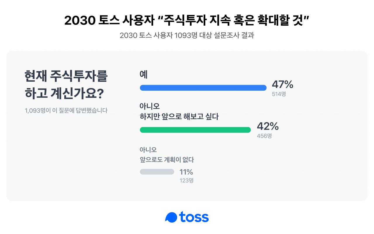 ‘토스’를 운영하는 비바리퍼블리카는 25일 토스증권의 출범을 앞두고 2030 토스 사용자 1093명을 대상으로 설문조사한 결과 47%가 이미 주식투자를 하고 있다고 밝혔다. 현재는 하지 않지만 앞으로 주식투자를 하겠다고 답한 사용자도 42%로 집계됐다. 투자계획이 없다는 답변은 11%에 그쳤다.