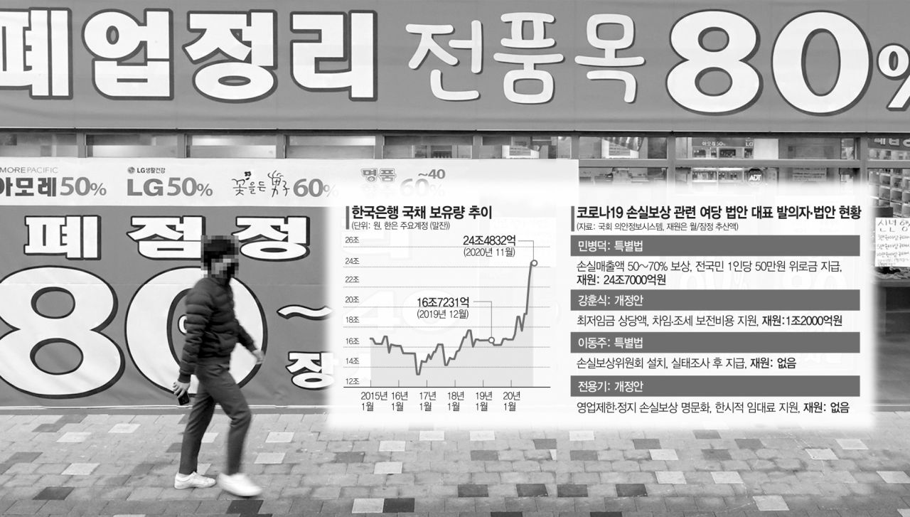 문제는 재원을 어떻게 마련할지는 확실히 정하지 않은 채, 국회 내에서 '한국은행의 국채매입'이 거론됐다는 점이다. 쉽게 말해 한은이 발권력을 동원해 돈을 풀고(정부가 발행한 국채 매입), 이 돈으로 자영업자와 소상공인 지원에 나서겠다는 것이다. 만약 올해에도 코로나19 재확산이 이어져 집합금지 조치가 이어지면 무한대로 돈이 필요할 수도 있다.
