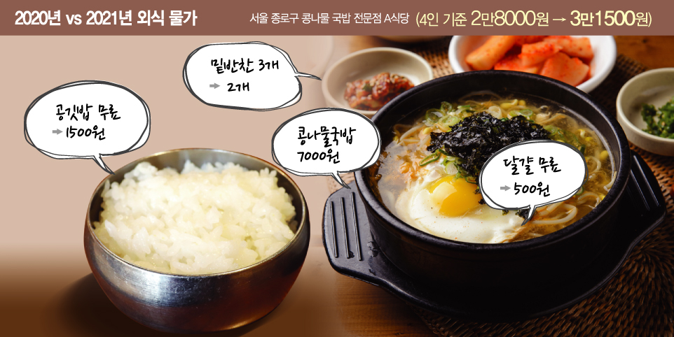 [아시아경제 이승진 기자] 서울 종로구의 한 콩나물 국밥집. 국밥 한 그릇 가격은 7000원으로 지난해와 같지만 손님들이 체감하는 가격은 1000원 이상 올랐다. 지난해까지 국밥에 올라가던 달걀은 올해부터 500원을 더 내야 준다. 기본 밑반찬은 3개에서 2개로 줄었고 테이블마다 한공기씩 공짜로 주던 공깃밥도 별도로 1500원을 내야 한다.