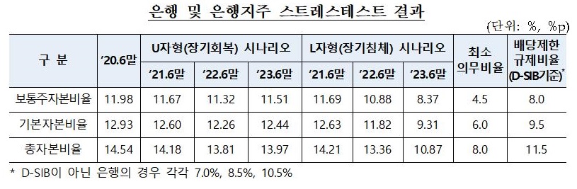 그 결과 U·L자형에서 모든 은행의 자본비율은 최소 의무비율을 넘었으나, L자형의 경우 상당수 은행이 배당제한 규제비율은 넘어서지 못한 것으로 나타났다. 배당제한 규제비율은 최소 의무비율에 시스템적으로 중요한 은행에 대해 1%를 더한 것이다. 총 자본비율 항목에서 기준이 11.5%다. 실제 은행들은 이 비율이 2021년 14.21%에서 매년 하락해 2023년에는 10.87%를 기록했다. 은행들이 대체로 손실흡수능력을 유지하나 코로나19가 장기화될 경우 일부 은행에서 자본 여력이 충분하지 않을 수 있다는 의미다.