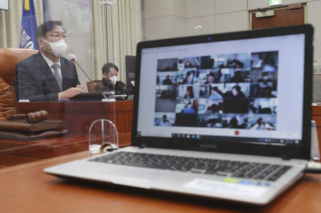 김태년 더불어민주당 원내대표가 27일 국회에서 열린 화상 정책의원총회에 참석, 모두발언을 하고 있다./윤동주 기자 doso7@