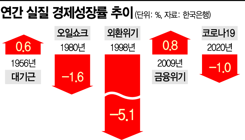 ◆지난해 경제성장률 -1%…외환위기 후 22년만에 첫 마이너스=한국은행에 따르면 지난해 실질 국내총생산(GDP)은 1830조5802억원으로 전년 보다 1% 감소했다. 한국의 경제성장률(GDP 성장률)이 마이너스를 기록한 것은 외환위기 때인 1998년(-5.1%) 이후 22년 만에 처음이다.