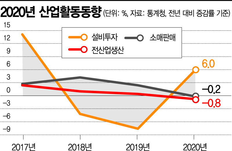 제조업생산은 경제 버팀목인 반도체 덕분에 0.5% 증가했다. 반도체생산은 전년 대비 23.9%, 기계장비는 5.5% 늘었고 자동차는 10.2% 줄었다. 반면 코로나19에 따른 내수 부진으로 지난해 소매판매액은 0.2% 줄어 카드대란으로 한국 경제가 위축된 2003년(-3.1%) 이후 17년만에 최대 폭으로 감소했다.