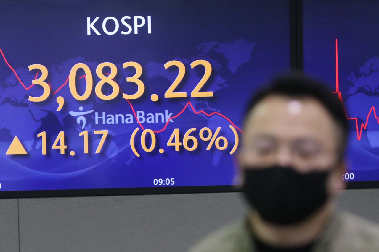 29일 서울 을지로 하나은행 딜링룸 전광판에 코스피 지수가 나오고 있다. 이날 코스피는 전 거래일보다 9.68포인트(0.32%) 오른 3,078.73에 시작해 상승 흐름을 보이고 있다. /문호남 기자 munonam@