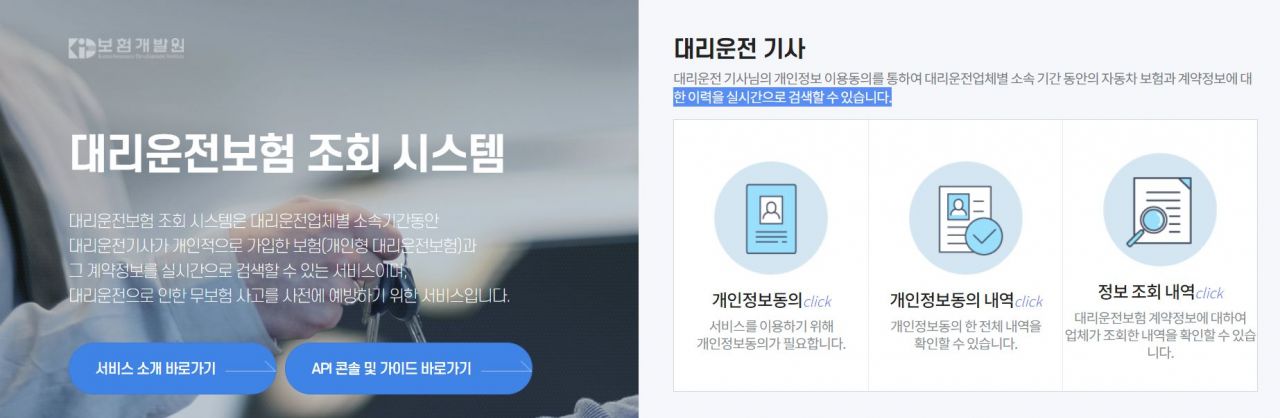 대리운전 개인보험 조회시스템도 가동대리운전업체가 대리기사의 개인보험 가입 여부를 실시간으로 확인할 수 있는 '대리운전 개인보험 가입조회시스템'도 지난 29일 오픈했다. 개인보험에 가입한 대리기사가 조회시스템에 접속해 본인 개인정보 입력·정보활용 동의를 거치면 대리업체가 보험가입 여부를 확인한 이후에 대리콜을 배정하는 방식이다.