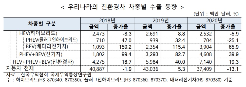 한국무역협회 국제무역통상연구원이 31일 발표한 '신성장 산업의 선두주자, 전기차의 수출동향과 시사점' 자료에 따르면 지난해 한국의 친환경차 수출은 71억4000만달러로 전년대비 19.3% 증가한 것으로 나타났다. 이는 배터리전기차, 플러그인 하이브리드차, 하이브리드차 등을 모두 포함한 것이다. 전체 자동차 수출 중 친환경차가 차지하는 비중은 19.1%로 2017년 8.6% 이후 꾸준히 늘고 있다.