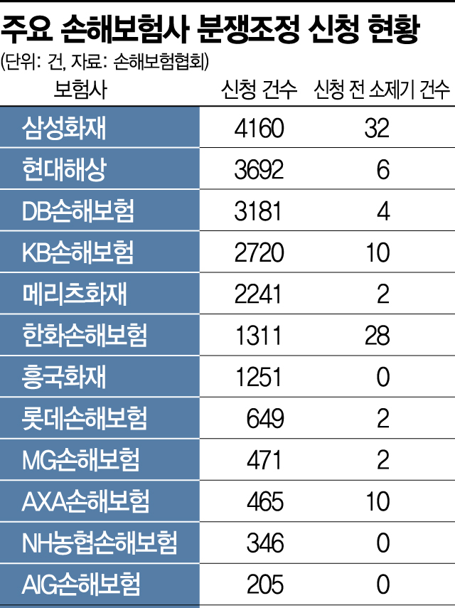 보험사별로는 삼성화재의 분쟁조정 신청건수가 4160건으로 가장 많았다. 이어 현대해상이 3692건, DB손해보험이 3181건, KB손해보험이 2720건, 메리츠화재가 2241건 순이었다.