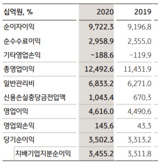 국민은행, 대출 늘었지만 희망퇴직 등 비용확대로 순이익 감소계열사별 실적은 KB국민은행이 당기순이익 2조2982억원으로 전년 대비 5.8% 감소했다. 견조한 대출성장 및 조달비용 감축 노력으로 이자이익이 꾸준히 확대되고 유가증권 및 파생상품ㆍ외환 관련 이익이 견조하게 증가했음에도 불구하고 희망퇴직 확대와 코로나19 관련 선제적 충당금 전입 등으로 비용이 증가한 영향이다. 특히 4분기 당기순이익은 4158억원으로 희망퇴직비용(세후 약 2190억원) 및 광고선전비 등 계절성 비용 증가와 코로나19 관련 추가충당금 전입(세후 약 950억원)으로 전분기 대비 감소했다.